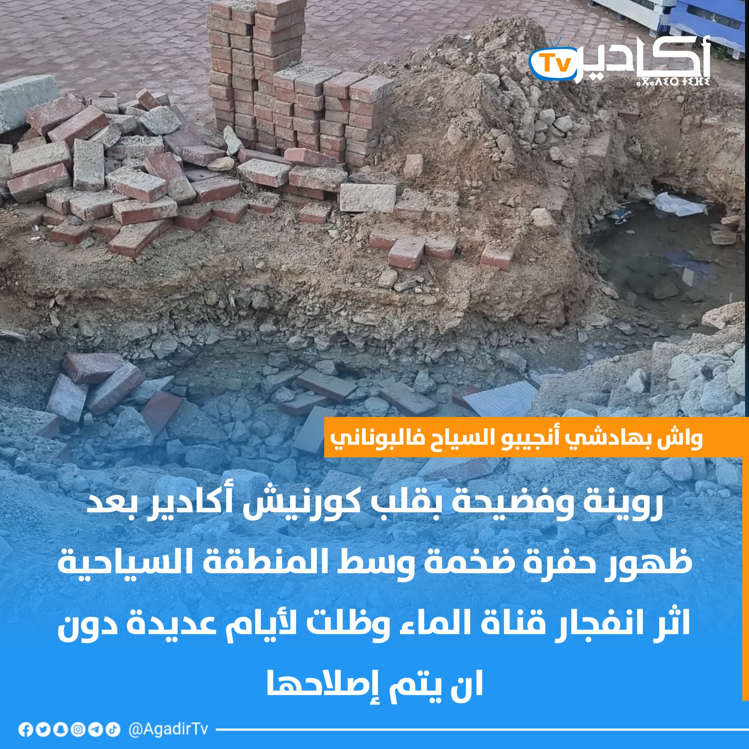 عرف كورنيش مدينة أكادير وسط المملكة في الأيام الأخيرة حالة من الفوضى بسبب ظهور حفرة ضخمة في وسط المنطقة السياحية إثر انفجار قناة مياه.