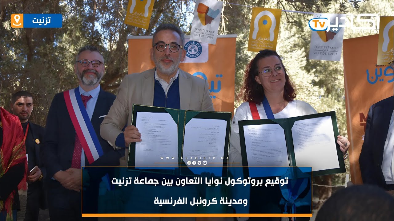 عرفت واحة تاركا صباح يوم أمس الأحد توقيع بروتوكول تعاون بين جماعة تزنيت والجماعتين الفرنسيتين كرونبل وفيلنوف، بحضور القنصل الفرنسي بأكادير، رئيس الجماعة الترابية لتزنيت عبد الله غازي، وعدد من المنتخبين والمسؤولين المحليين، إضافة إلى فعاليات المجتمع المدني.