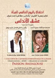 يحيي كل من الفنانة سامية أحمد و الفنان رشيد زروال بمناسبة اليوم العالمي للمرأة حفــلا فنــــيا تحت عنوان ” عشــــق الأنــدلـــس “.