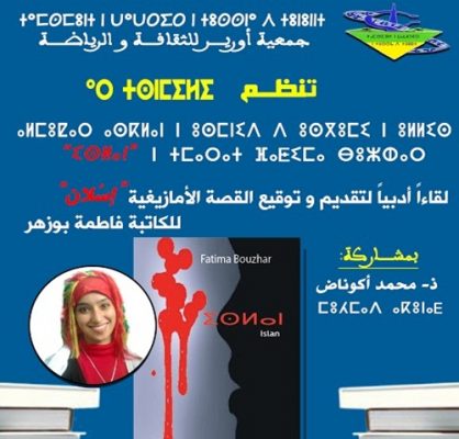 تنظم جمعية أورير للثقافة والرياضة لقاءً أدبياً لتقديم وتوقيع القصة الأمازيغية “إسْلان” للكاتبة فاطمة بوزهر بمشاركة الأديب الأمازيغي محمد أكوناض، وذلك يوم السبت 07 ماي 2016 إبتداء من الساعة الرابعة بعد الزوال بدار الشباب أورير.