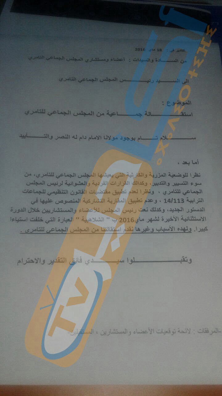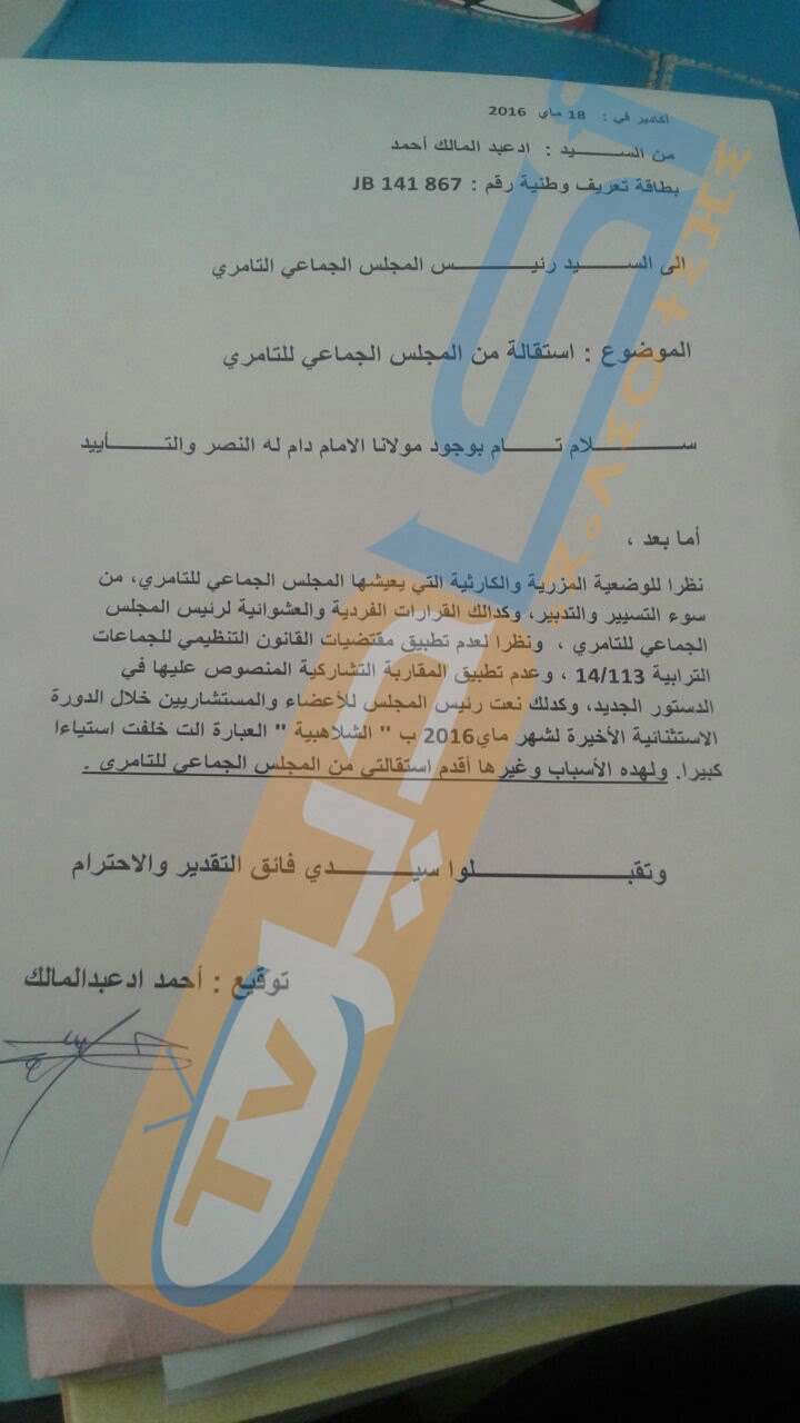 و ختم المستقيلون بالقول “ولهذه الأسباب و غيرها نقدم استقالتنا من المجلس الجماعي للتامري.”