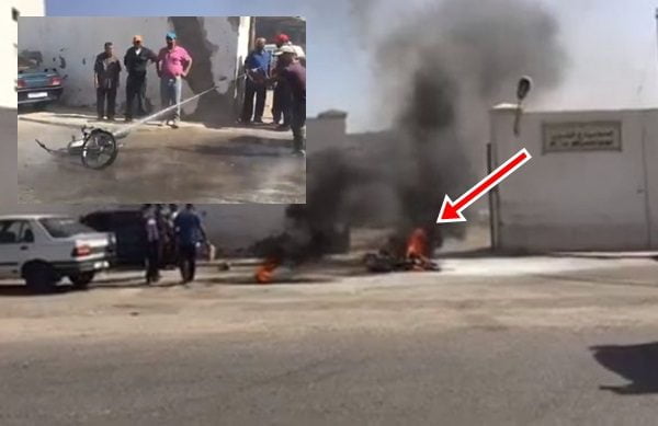 بث مواطن في المباشر على موقع التواصل الاجتماعي الفايسبوك، لحظة احتراق دراجة دراجة نارية في ملكية المجلس البلدي لمدينة أكادير صباح اليوم الخميس أمام المستودع البلدي.