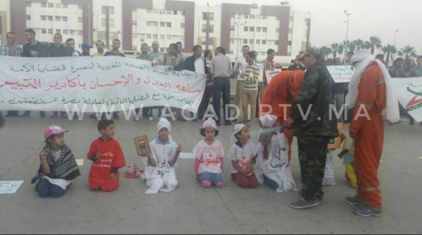 ورفع المحتجون في هذه الوقفة التي تزعمتها جماعة العدل والإحسان بمدينة أكادير شعارات تطالب المجتمع الدولي بوقف أعمال الإبادة ضد مسلمي الروهينغا.