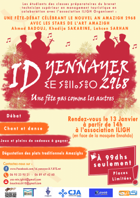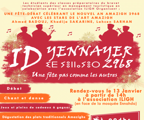 بمناسبة رأس السنة الأمازيغية الجديدة 2968، ينظم طلبة (السنة الثانية) الأقسام التحضيرية، شهادة التقني العالي في شعبة التدبير السياحي بتعاون مع جمعية إيليغ للتنمية والتعاون، يوما احتفاليا تحت شعار “سريتون اسراتيميم تامونت” ( بكم تحلى اللمة)، وذلك يوم 13 يناير 2018.