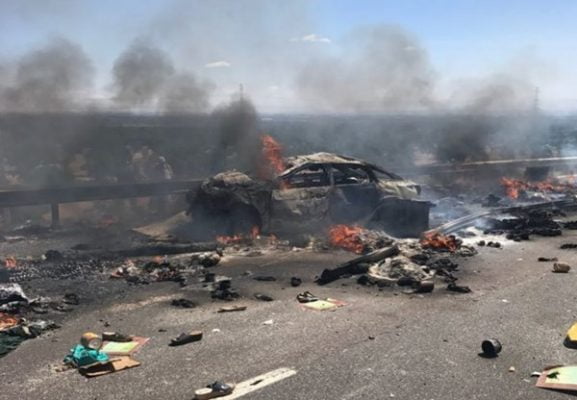 وقالت مصادر محلية، إن الحادث أودى بحياة 5 أشخاص، وأصيب آخرون إصابات متفاوتة الخطورة، إثر اصطدام قوي بين شاحنتين من الحجم الكبير، الذي غير مسار الشاحنة لتصطدم بسيارتين قبل أن تندلع ألسنة النيران فيهما معا.