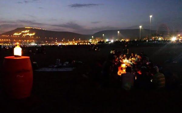 حول هذه “المائدة الرملية” تتحلق المجموعات المكونة من أسر أو أصدقاء وصديقات ، بعد إطلاق قطعة من البلاستيك أو القماش التي يمدد فوقها ما طاب من المشروبات والمأكولات الشهية التي أعدت خصيصا لاقتسام لحظات من المتعة الحميمية بعد الإعلان عن آذان المغرب ، وأيضا من أجل الخروج عن طقوس الإفطار المعتادة داخل البيوت .