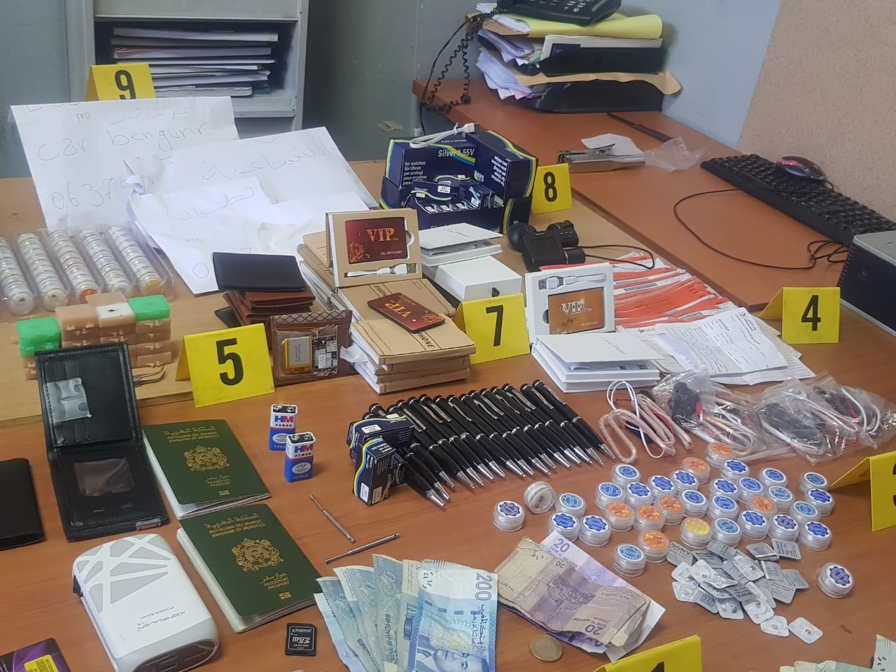 وقد مكنت عمليات التفتيش المنجزة في إطار هذه القضية من حجز معدات إلكترونية متطورة بحوزة المشتبه فيهما، وهي عبارة عن 160 سماعة لاسلكية من مختلف الأصناف، بالإضافة إلى أثني عشر قلما وتسعة حافظات أوراق موصولة بأجهزة اتصال لاسلكية، وكذا 590 بطارية صغيرة الحجم، و20 شريحة اتصال خاصة بالهواتف المحمولة، فضلا عن مبالغ مالية وهواتف نقالة ووثائق شخصية.