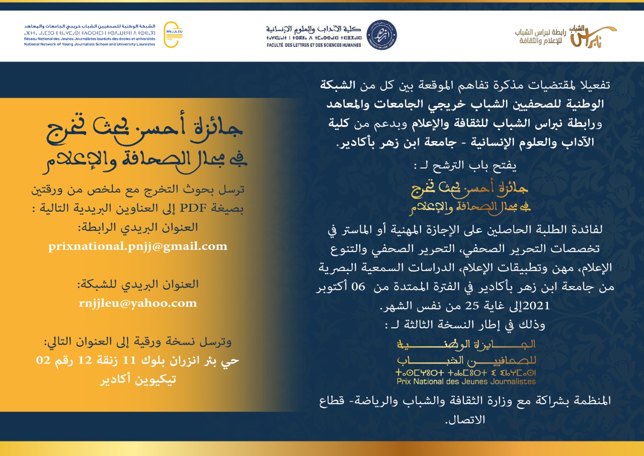 وحسب بلاغ الرابطة، فقد جاء الاعلان عن الجائزة في إطار تفعيل مقتضيات “مذكرة تفاهم الموقعة بين كل من الشبكة الوطنية للصحفيين الشباب خريجي الجامعات والمعاهد ورابطة نبراس الشباب للثقافة والإعلام وبدعم من كلية الآداب والعلوم الإنسانية- جامعة ابن زهر بأكادير، يفتح باب الترشح لجائزة أحسن بحث التخرج لفائدة الطلبة الحاصلين على الإجازة المهنية أو الماستر في تخصصات التحرير الصحفي، التحرير الصحفي والتنوع الإعلام، مهن وتطبيقات الإعلام، الدراسات السمعية البصرية من جامعة ابن زهر بأكادير في الفترة الممتدة من 06 أكتوبر 2021 إلى غاية 25 من نفس الشهر.”