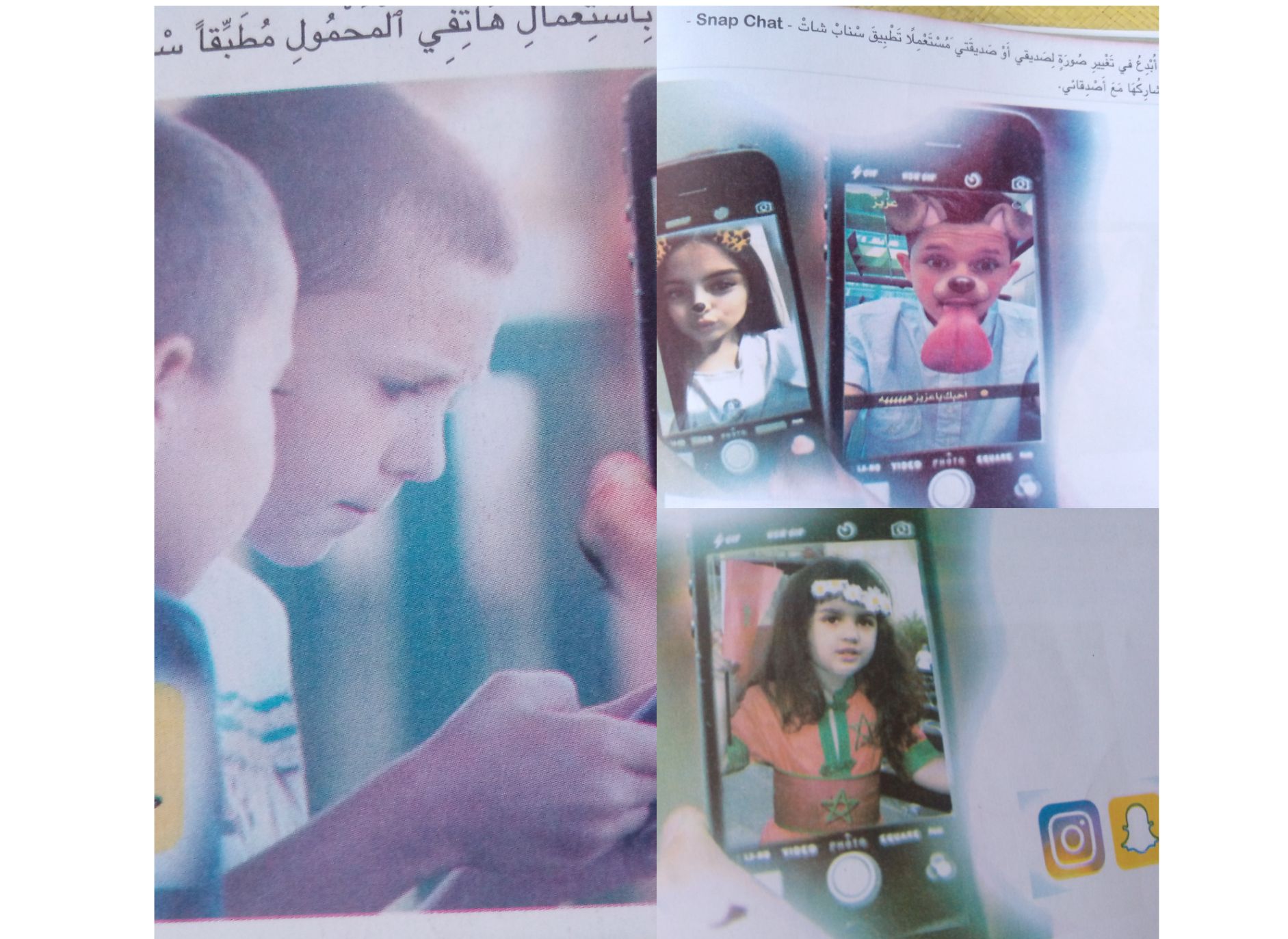 وتحمل الصفحات 58، 61، 62 من هذا المقرر صورة لأطفال على تطبيق “سناب شات” ومكتوب فوق الصورة “أبدع في تغيير صورة لصديقي أو صديقتي باستعمال تطبيق سناب شات”.