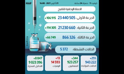 بينما وصل عدد الملقحين بالجرعة الثانية إلى 21 مليون و 230 ألف و660 شخصا، فيما بلغ عدد متلقي الجرعة الأولى 23 مليون و 440 ألف و 505 اشخاص.