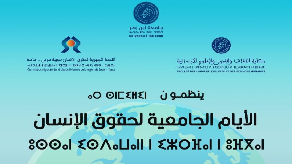 تنظم اللجنة الجهوية لحقوق الإنسان بجهة سوس-ماسة، بشراكة مع كلية اللغات والفنون والعلوم الإنسانية بأيت- ملول، التابعة لجامعة ابن زهر أكادير، الأيام الجامعية لحقوق الإنسان من 07 إلى 09 مارس 2022، بالقطب الجامعي بأيت ملول.