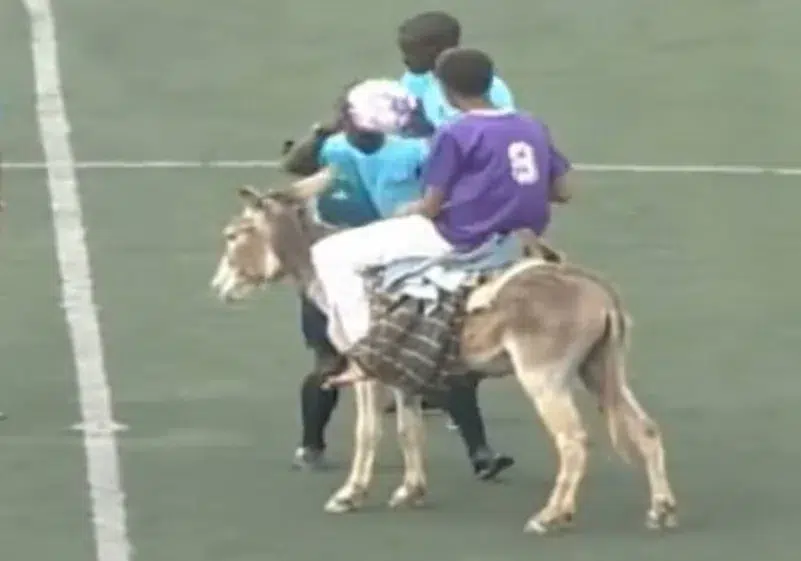 ويظهر في الفيديو حكام المباراة وهم ينتظرون الكرة التي يقدمها شاب يمتطي حمارا، ويغادر بعدها أرض الملعب