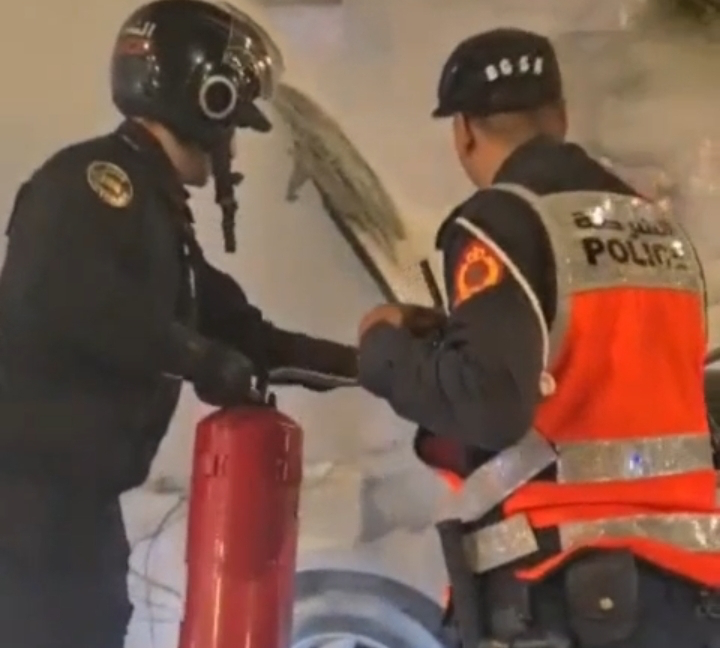 أظهر مقطع فيديو متداول على تطبيقات التراسل الفوري ومواقع التواصل الإجتماعي، شرطي من فرقة الدراجين بزيه الرسمي، وهو يحاول إخماد حريق مشتعل شبّ في سيارة خاصة بأحد شوارع مدينة أكادير.