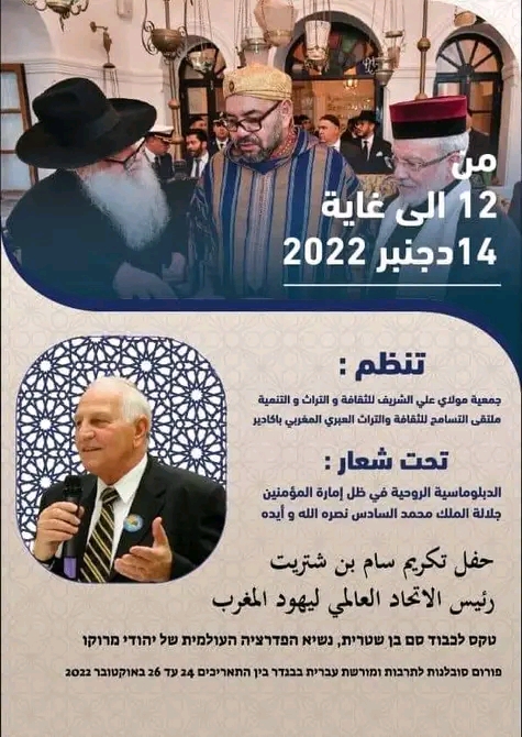 وتميز الملتقى بتكريم سام بن شتريت رئيس اتحاد العالمي ليهود المغرب،نظير ما يقدمه في اطار تعايش الديانات وبعث روح التعايش والتسامح بين الجميع كما تم خلال افتتاح الملتقى ترديد النشيدين الوطني المغربي والاسرائلي فالدعاء بالعبرية للملك محمد السادس.