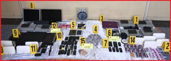 كما أسفرت عمليات التفتيش المنجزة في هذه القضية عن حجز مجموعة من بطائق التعبئة والشرائح الهاتفية الخاصة بمزودي خدمات هاتفية وطنية، وثلاثة حواسيب محمولة ووحدة مركزية للكمبيوتر، علاوة على أجهزة إلكترونية ودعامات معلوماتية تستعمل في هذا النشاط الإجرامي.