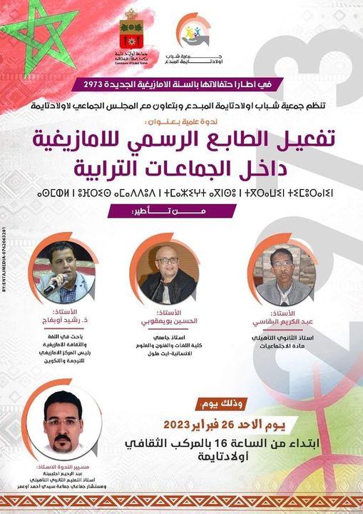 في إطار الاحتفال بالسنة الأمازيغية قررت جمعية شباب اولاد التايمة المبدع وذلك بالتعاون مع المجلس الجماعي لذات المدينة, تنظيم ندوة علمية ابتداء من الساعة الرابعة زوالا من يوم الأحد 26 فبراير الجاري بالمركب الثقافي باولاد التايمة.