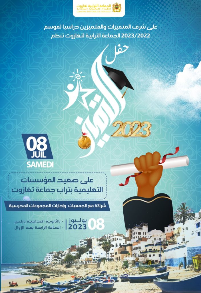 بمناسبة سن جماعة تغازوت شمال أكادير لسياسة الإعتراف والتشجيع للناشئة، تحتفل الجماعة بالمتفوقين دراسيا من أبنائها في المؤسسات التعليمية بترابها خلال الموسم الدراسي 2022/2023.