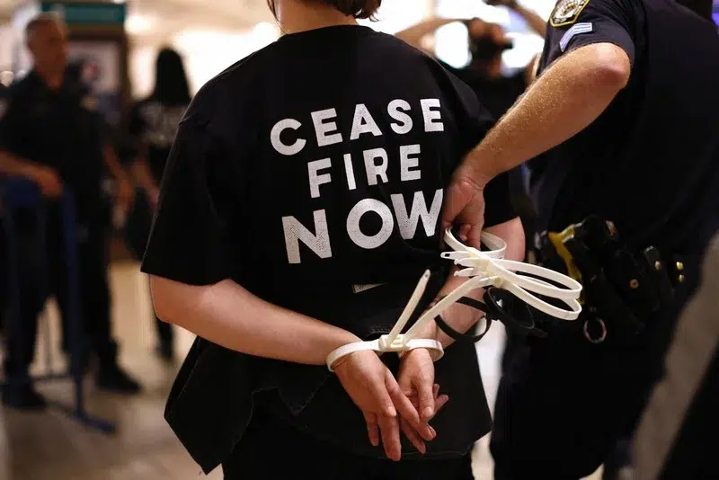 في نيويورك، تم اعتقال ما بين 200 و300 شخص يوم الجمعة الماضي، وفقا للشرطة والمنظمين، بعد أن شاركوا في احتجاج سلمي نظمته حركة يهودية مناهضة للعدوان الإسرائيلي على غزة. وكان المحتجون يرتدون قمصانا كتب عليها شعارات مثل “ليس باسمنا” و”وقف إطلاق نار الآن”، وحملوا لافتات تطالب بالحرية للفلسطينيين. وأدى حاخامات صلاة الموتى اليهودية وأضاءوا شموع عطلة السبت في قاعة رئيسية بمحطة غراند سنترال للقطارات، التي ازدحمت بالمشاركين في الاعتصام.