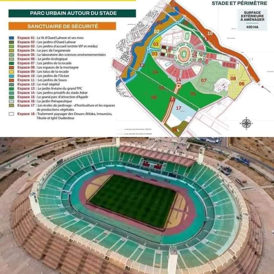 في إطار مبادرة تهدف إلى تحسين البنية التحتية وتعزيز النشاط الاجتماعي والاقتصادي في المدينة، يتم حاليا تنفيذ مشروع ضخم لتحويل المحيط الخارجي لملعب مدينة أكادير الكبير إلى منتزه حضري ممتد على مساحة 400 هكتار.