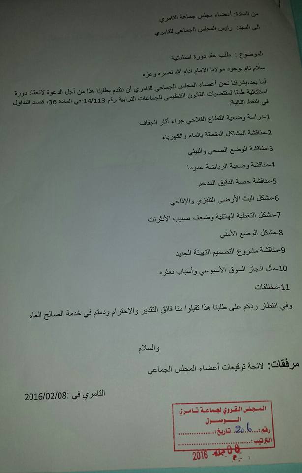كتلة الإصلاح تطالب رئيس المجلس الجماعي للتامري عبد الله أبرني بعقد دورة استثنائية