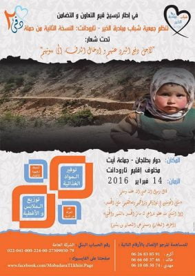 في إطار أنشطتها الإجتماعية والتضامنية و ترسيخ قيم التعاون تنظم جمعية شباب مبادرة الخير تارودانت ، النسخة الثانية من حملة دفئ لجمع و توزيع الملابس و الأغطية و المواد الغدائية ،وذلك يوم 14 فبراير 2016 لفائدة ساكنة دوار بطلجان، جماعة أيت مخلوف، دائرة أو قيادة تامالوكت إقليم تارودانت، الحملة تتكون من عملية جمع و توزيع الملابس و الاغطية بالاضافة للمواد الغدائية و انشطة ترفيهية لاطفال الجماعة .