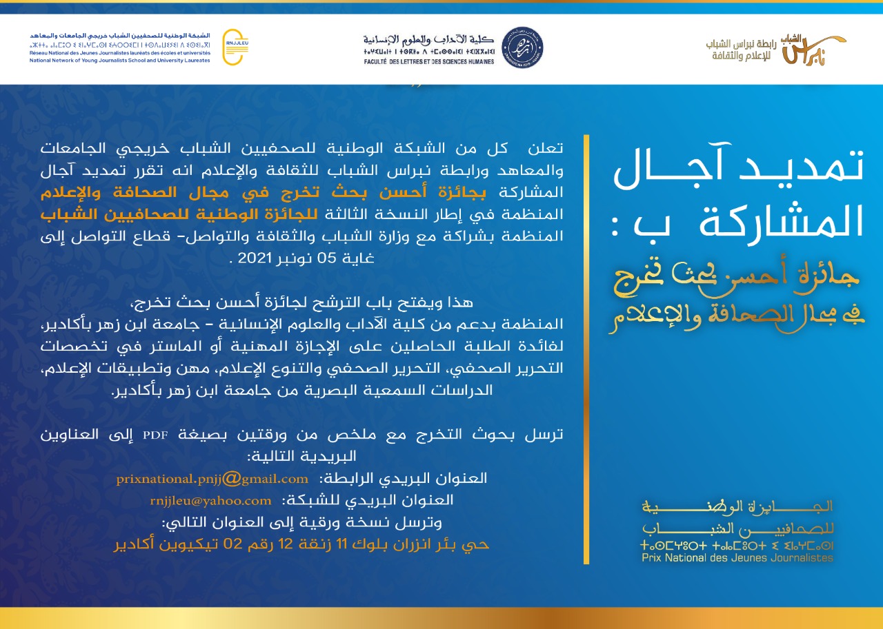 أعلنت رابطة نبراس الشباب، عن تمديد آجال المشاركة بجائزة أحسن بحث تخرج في مجال الصحافة والإعلام. وحسب بلاغ الرابطة فإن” الشبكة الوطنية للصحفيين الشباب خريجي الجامعات والمعاهد ورابطة نبراس الشباب [...]